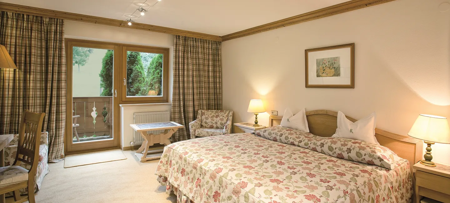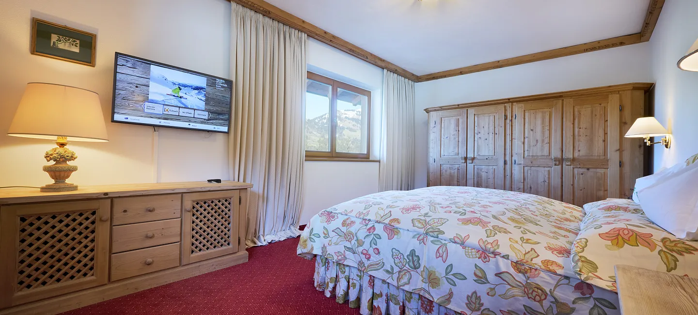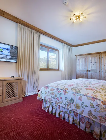 Unsere Doppelzimmer im Tiroler Stil sind mit 22–26 m² großzügig geschnitten und mit einem komfortablen Doppelbett ausgestattet. Ein kleiner Vorraum mit Kleiderschrank sorgt für zusätzlichen Stauraum. Alle Zimmer verfügen über einen Schreibtisch, eine gemütliche Sitzgelegenheit, Flachbildschirm, Telefon und Safe.